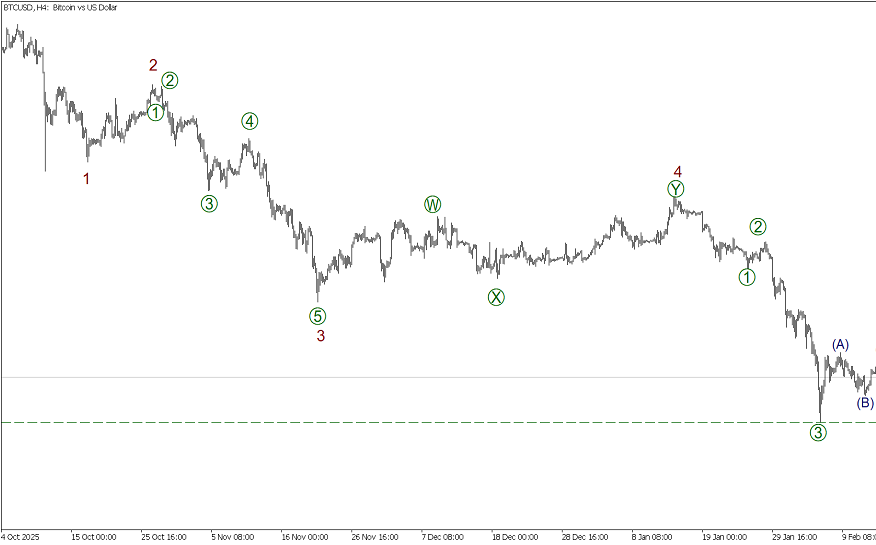 Предполагается, что по Биткоину формируется медвежья импульсная волна (A), которая состоит из подволн 1-2-3-4-5. Завершены первые четыре части, сейчас строится финальная подволна 5 в виде импульса [1]-[2]-[3]-[4]-[5]. Возможно, завершилась коррекция [4] в форме зигзага (A)-(B)-(C). В ближайшее время ожидается снижение в подволне [5] к минимуму 60622.63, который отметила подволна [3].
