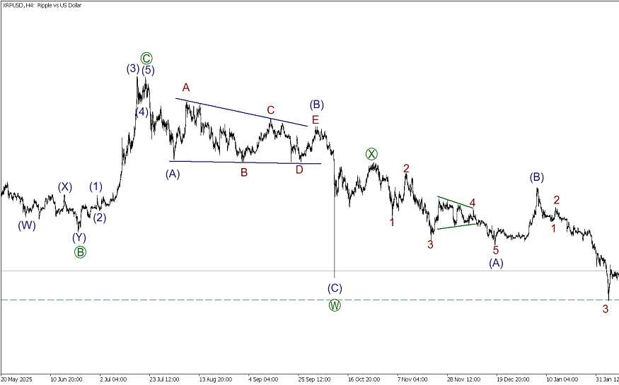 По XRPUSD в глобальной перспективе формируется бычий импульс (1)-(2)-(3)-(4)-(5). На текущем графике представлена коррекция (4), она принимает форму двойного зигзага W-X-Y. В процессе развития действующая волна Y, она тоже похожа на двойной зигзаг [W]-[X]-[Y]. Внутри заключительной действующей волны [Y] завершены импульсная волна (A) и коррекция (B). В процессе развития волна (С), внутренняя структура которой похожа на конечный диагональник 1-2-3-4-5. В рамках данной фигуры, предположительно, завершилась коррекция 4. В ближайшее время ожидается снижение в подволне 5 of (C) к минимуму 1.142.