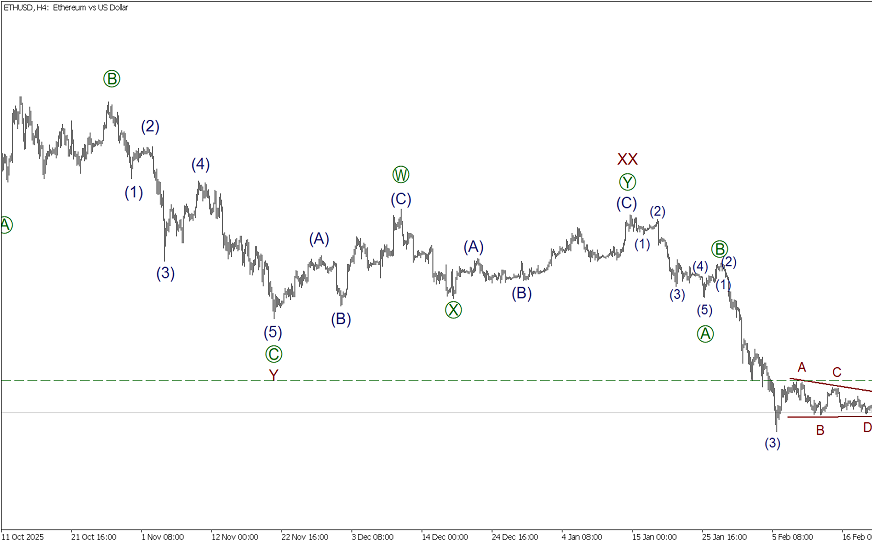 По ETHUSD формируется крупный восходящий зигзаг (A)-(B)-(C). Завершена первая импульсная волна (A), и, предположительно, подошла к концу коррекция (B) в виде тройного зигзага. На последнем участке графика идет развитие начальной части потенциальной бычьей волны в форме импульса. В ближайшее время ожидается построение восходящей волны 1, которая может завершиться около максимума 2153.91.