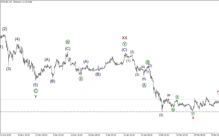По ETHUSD формируется крупный восходящий зигзаг (A)-(B)-(C). Завершена первая импульсная волна (A). Предположительно, формируется сложная коррекция (B), она принимает форму тройного зигзага. Волна Z может завершиться в виде зигзага [A]-[B]-[C]. На последнем участке графика можно заметить завершенную коррекцию (4) of [C] в форме двойной тройки W-X-Y. Ожидается снижение в подволне (5) к уровню 1774.86.