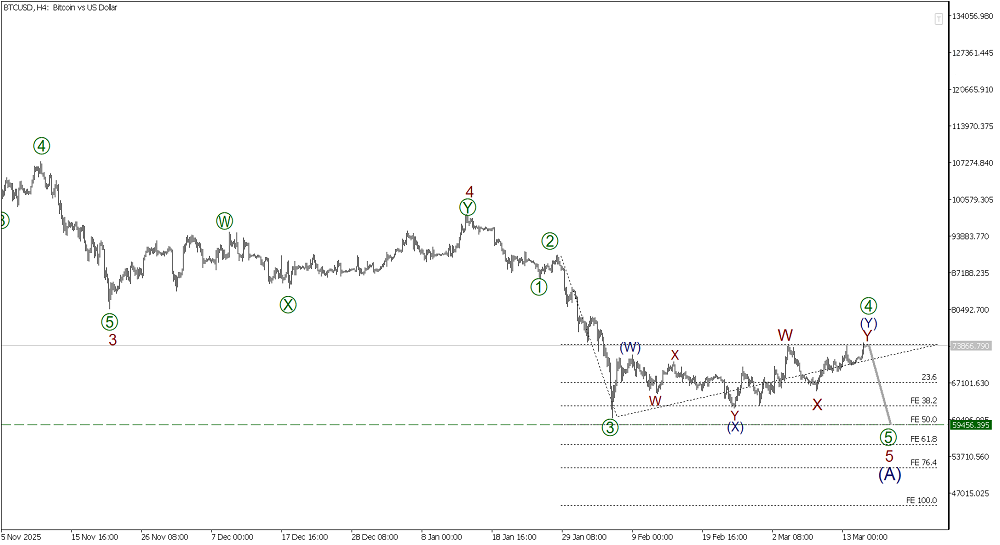 Предполагается, что по Биткоину в глобальной перспективе формируется медвежий зигзаг (A)-(B)-(C). На текущем графике представлена разметка импульса (A). Первые четыре части этого импульса уже построены, в стадии развития конечная часть – импульс 5. В составе волны 5 сформированы подволны [1]-[2]-[3]-[4]. Коррекция [4] – двойной зигзаг. В ближайшее время ожидается снижение в подволне [5] в направлении 59456.39. На данном уровне величина волны [5] составит 50% от волны [3].