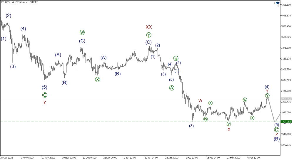 По ETHUSD формируется крупный восходящий зигзаг (A)-(B)-(C). Завершена первая импульсная волна (A). Предположительно, формируется сложная коррекция (B), она принимает форму тройного зигзага. Волна Z может завершиться в виде зигзага [A]-[B]-[C]. На последнем участке графика можно заметить завершенную коррекцию (4) of [C] в форме двойной тройки W-X-Y. Ожидается снижение цены в подволне (5) к уровню 1774.86.