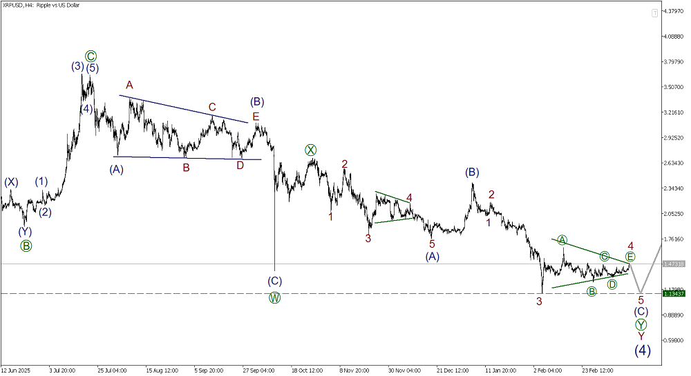 - XRPUSD: продолжается снижение в рамках импульса (C). Рекомендуется рассматривать короткие позиции с целью на минимуме 1.134.