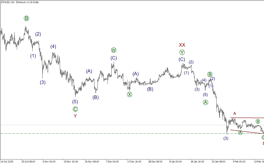 По ETHUSD формируется крупный восходящий зигзаг (A)-(B)-(C). Завершена первая импульсная волна (A). Предположительно, формируется сложная коррекция (B), она принимает форму тройного зигзага. Волна Z вскоре может завершиться в виде зигзага [A]-[B]-[C]. На последнем участке графика можно заметить завершенную коррекцию (4) of [C] в форме треугольника. Ожидается снижение в подволне (5) к уровню 1793.67.