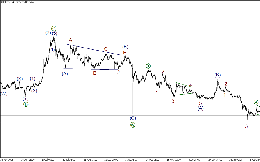 По XRPUSD в глобальной перспективе формируется бычий импульс (1)-(2)-(3)-(4)-(5). На текущем графике представлена коррекция (4), она принимает форму двойного зигзага W-X-Y. В процессе развития действующая волна Y, она тоже похожа на двойной зигзаг [W]-[X]-[Y]. Внутри заключительной действующей волны [Y] завершены импульсная волна (A) и коррекция (B). В процессе развития волна (С), внутренняя структура которой похожа импульс 1-2-3-4-5. В рамках данной фигуры завершилась треугольная коррекция 4. В ближайшее время ожидается снижение в подволне 5 of (C) к минимуму 1.142.