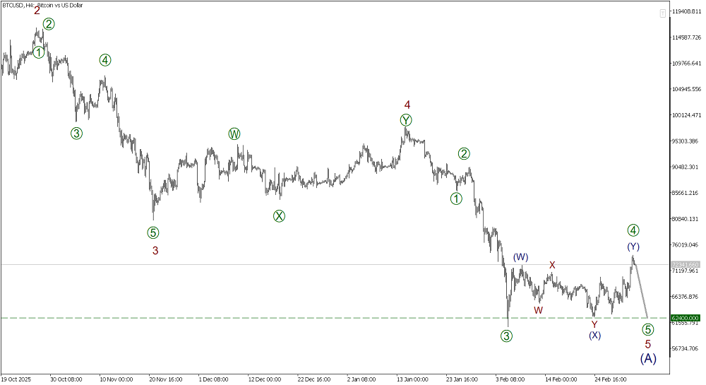Предполагается, что по Биткоину в глобальной перспективе формируется медвежий зигзаг (A)-(B)-(C). На текущем графике представлена разметка импульса (A). Первые четыре части этого импульса уже построены, в стадии развития конечная часть финальной подволны 5. Скорее всего, завершилась коррекция [4] of 5, принявшая форму двойной тройки, в ближайшее время ожидаю снижение в подволне [5] of 5 в направлении минимума 62400.00.