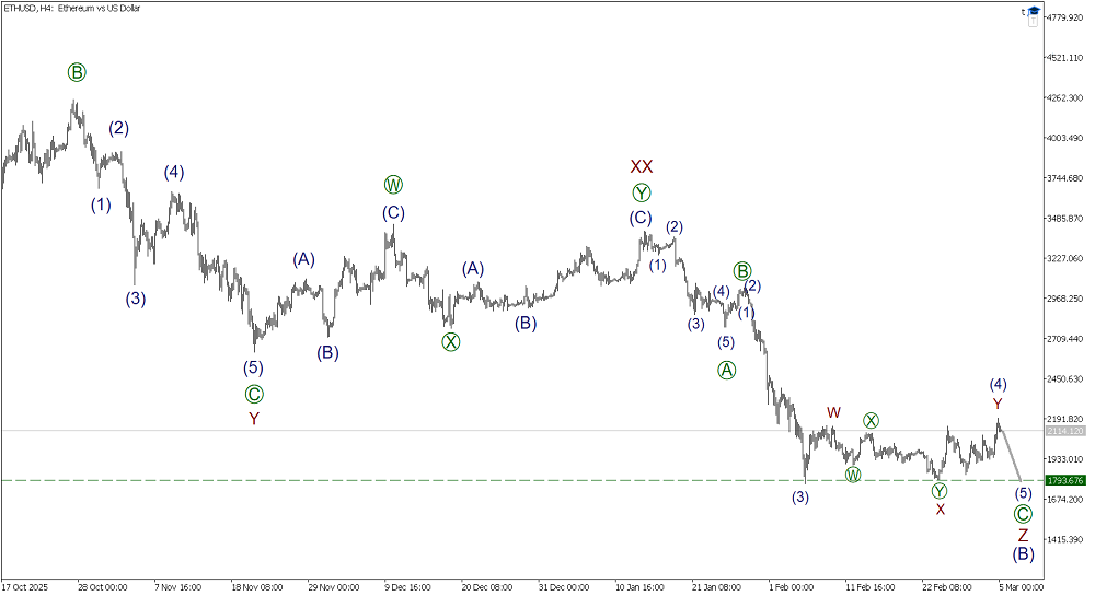 По ETHUSD формируется крупный восходящий зигзаг (A)-(B)-(C). Завершена первая импульсная волна (A). Предположительно, формируется сложная коррекция (B), она принимает форму тройного зигзага. Волна Z вскоре может завершиться в виде зигзага [A]-[B]-[C]. На последнем участке графика можно заметить завершенную коррекцию (4) of [C] в форме двойной тройки W-X-Y. Ожидается снижение в подволне (5) к уровню 1793.67.