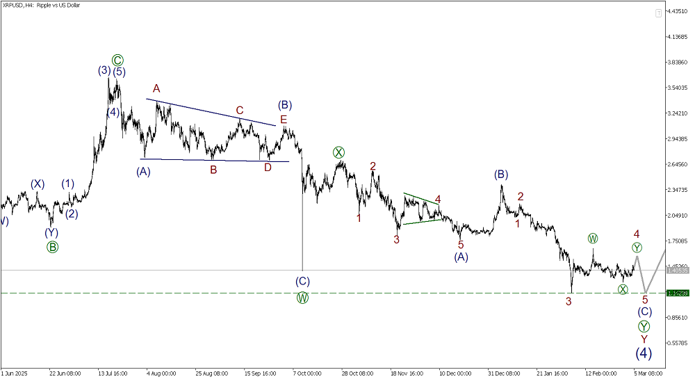По XRPUSD в глобальной перспективе формируется бычий импульс (1)-(2)-(3)-(4)-(5). На текущем графике представлена коррекция (4), она принимает форму двойного зигзага W-X-Y. В процессе развития действующая волна Y, она тоже похожа на двойной зигзаг [W]-[X]-[Y]. Внутри заключительной действующей волны [Y] завершены импульсная волна (A) и коррекция (B). В процессе развития волна (С), внутренняя структура которой похожа на импульс 1-2-3-4-5. В рамках данной фигуры приближается к концу сложная коррекция 4, состоящая их подволн [W]-[X]-[Y]. В ближайшее время ожидается снижение в подволне 5 of (C) к минимуму 1.142.