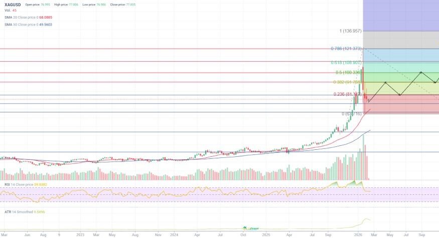 2026 год рынок начал с мощного ралли. В январе серебро впервые закрепилось выше $100.00, поднявшись примерно к $121.00. Однако затем последовал резкий разворот: за несколько дней цена снизилась в район $70.00 на фоне активной фиксации прибыли и пересмотра ожиданий по процентным ставкам. После этого котировки частично восстановились, но торговля оставалась нервной и чувствительной к новостному фону.