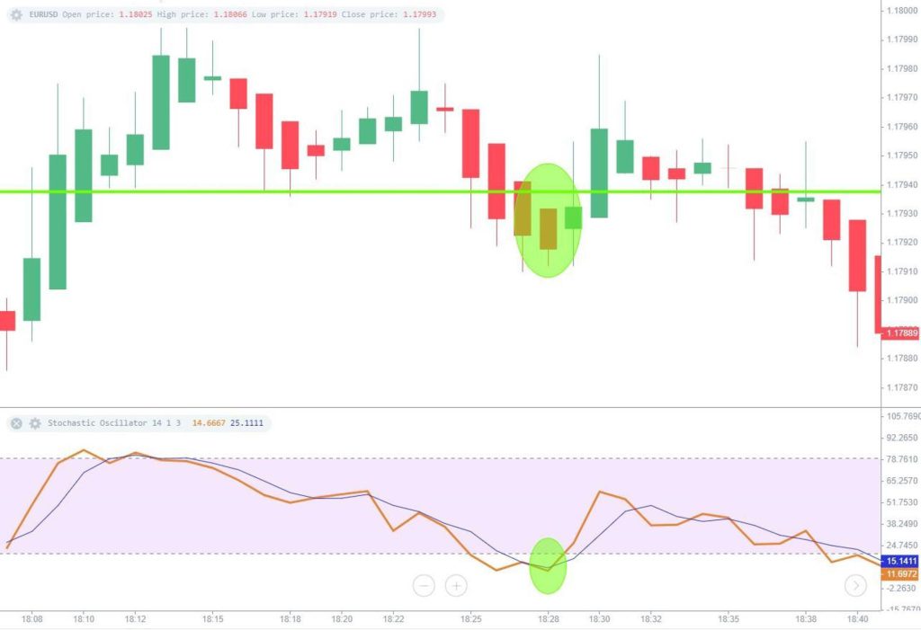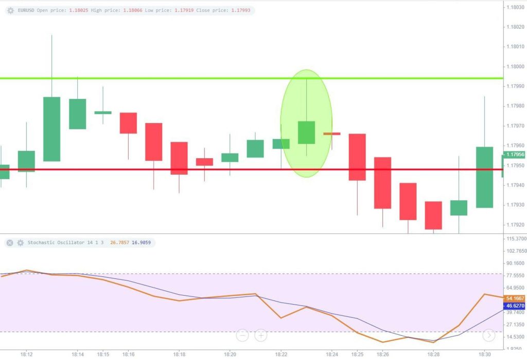 На графике зеленой областью отмечен целевой бар, для которого будут рассчитываться показания стохастика. Цена его закрытия равна 1,17972 пункта. Зеленой линией – самая большая цена за последние 3 свечи. Она составляет 1,17994 пункта. Красной линией отмечен минимум за последние 3 свечи, составляющий 1,17948 пункта.