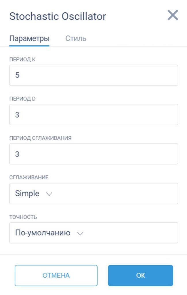 Периодичность для всех стохастиков одинакова: %K – 5, %D – 3. Период сглаживания для всех, кроме быстрого стохастика, 3.