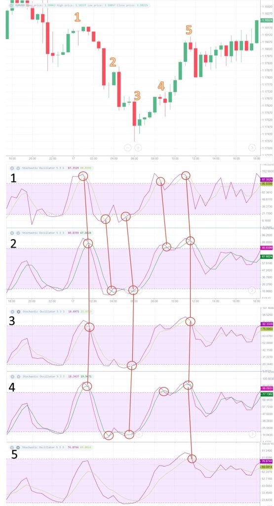 Выше для сравнения расположен ценовой график, на котором цифрами отмечены 5 сигналов стохастического осциллятора.