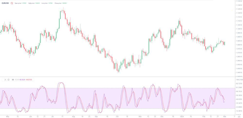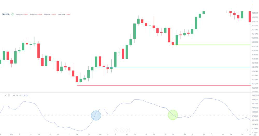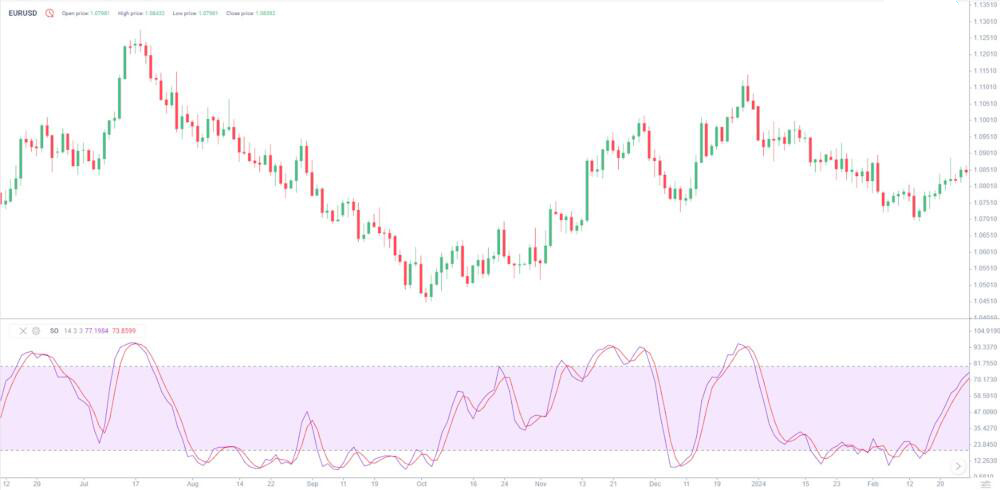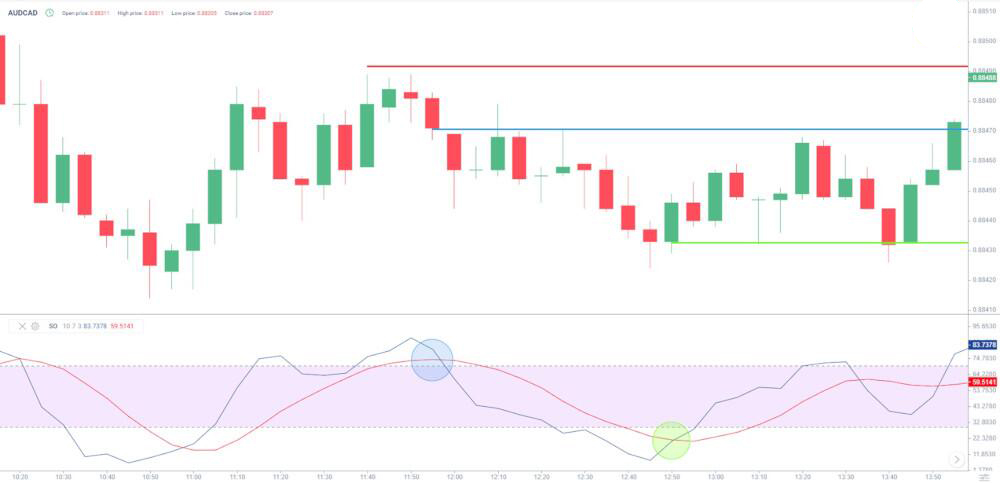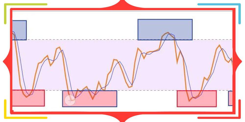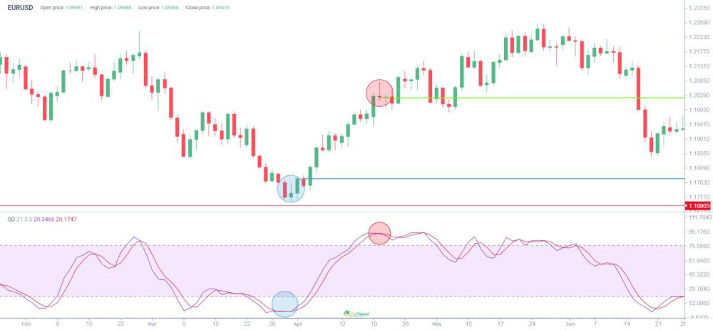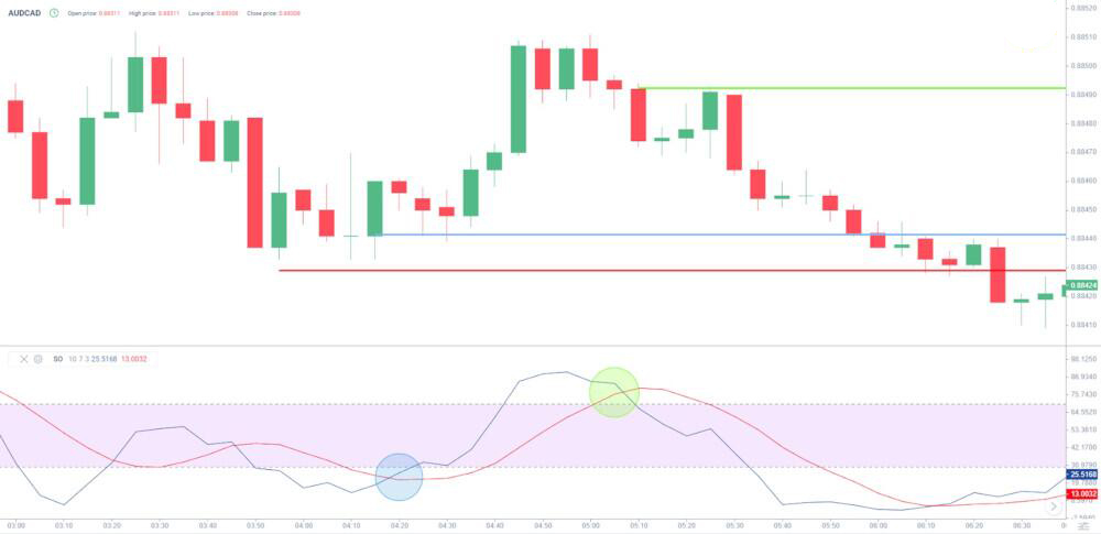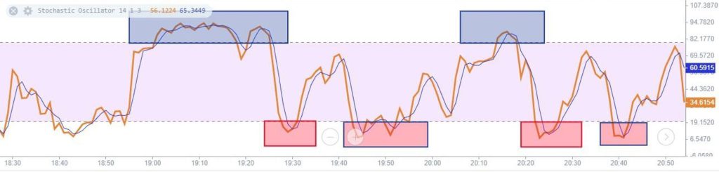 Инструмент считается перекупленным, когда две движущиеся линии находятся над верхним уровнем 80% (отмечено синими областями вверху), а перепроданной, когда они пробиваются ниже нижней горизонтальной линии 20% (красные области снизу).