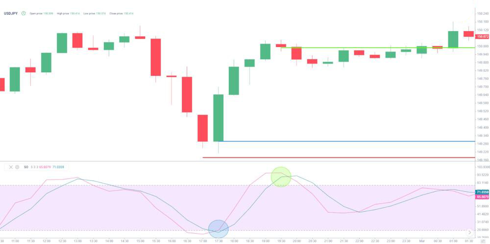 - Линия %K пересекает %D снизу вверх ниже уровня 20%;