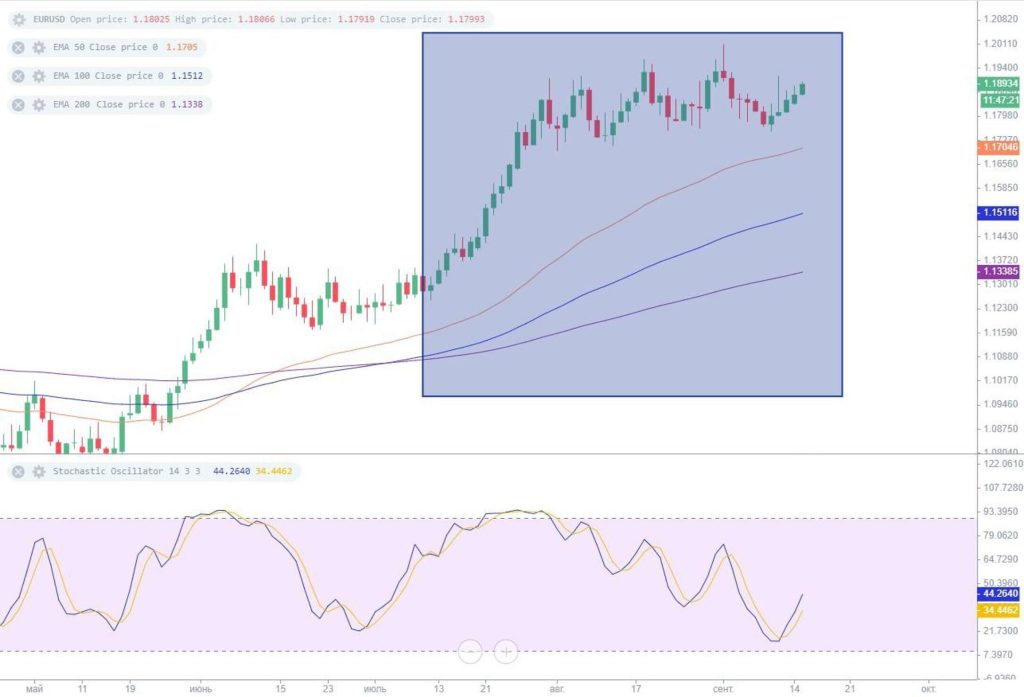 На графике EURUSD добавлен индикатор Stochastic с настройками 14.3.3. В отличие от предыдущего примера, линии индикатора более плавные: алгоритм учитывает более широкий ценовой диапазон в течение определенного времени. Значит, разворотные сигналы появляются реже, и среди них меньше ложных.