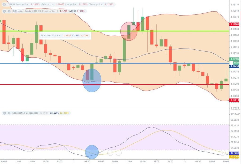 Рассмотрим стратегию Боллинджера и стохастика на примере.
