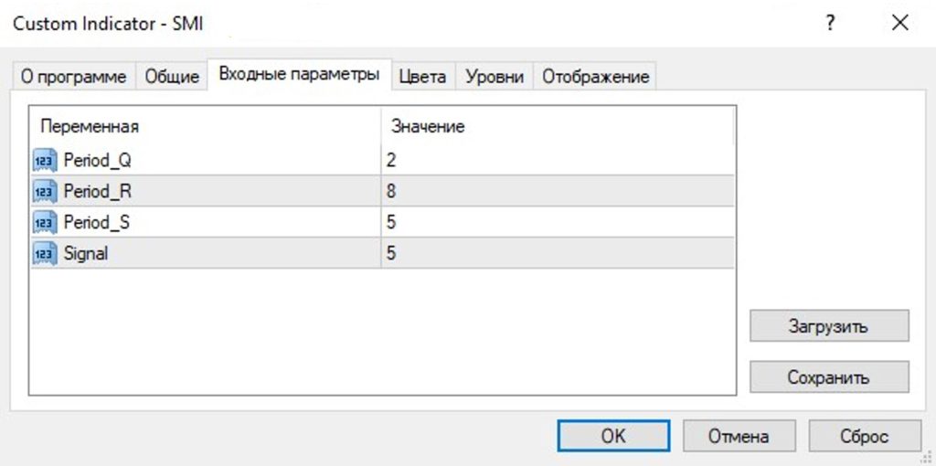 Установите и запустите индикатор. В открывшемся окне во вкладке “Входные параметры” можно изменить настройки индикатора: