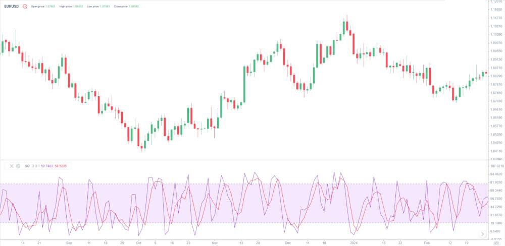 - Стохастический осциллятор — это индикатор импульса, измеряющий положение цены закрытия относительно диапазона цен за период, выявляя перекупленность (>80%) и перепроданность (