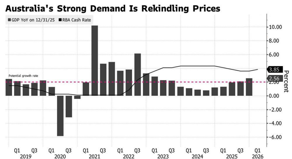 В четвертом квартале экономика Австралии расширилась на 0,8% кв/кв, данные за третий квартал были пересмотрены в сторону повышения, и вуаля – по итогам 2025 валовой внутренний продукт вырос на 2,6%. Речь идет о лучшей динамике показателя за три года. Он превзошел прогноз в 2,3%.