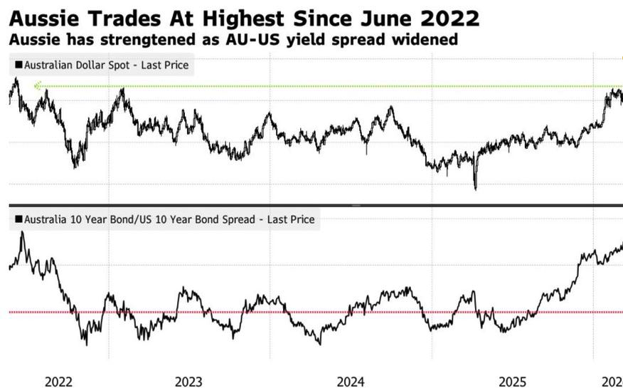 Ожидания повышения Резервным банком ключевой ставки на фоне длительной паузы ФРС расширили спреды австралийских и американских облигаций до максимальных уровней с октября 2022. Это обеспечивает перемещение капитала из Северной Америки в Австралию и обеспечивает прочный фундамент под ралли AUDUSD.