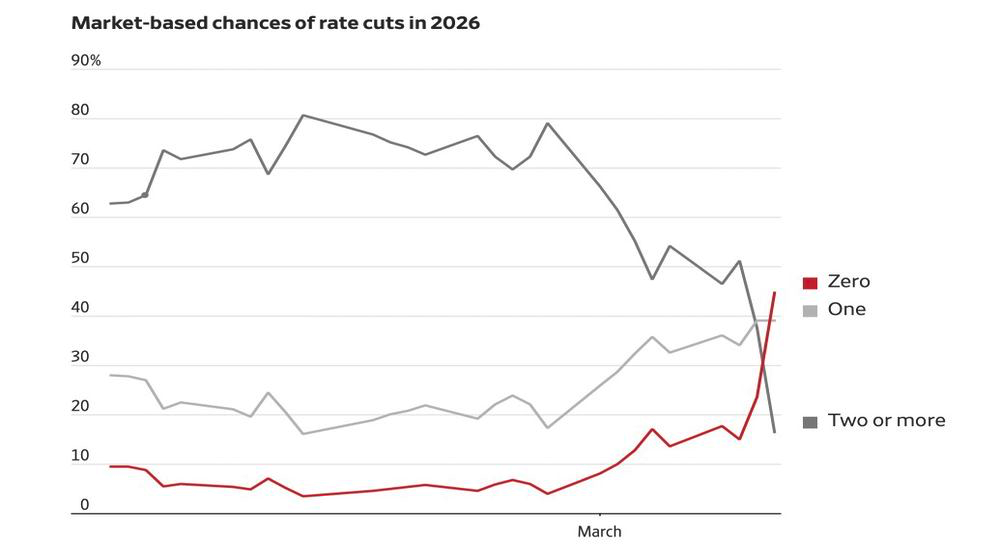 Именно так разрушается мировая экономика. МЭА называет текущий сбой в поставках самым серьезным в истории, на рынках рассуждают о взлете североморского сорта к $150 за баррель, а деривативы повышают шансы, что ФРС ни разу не снизит ставку по федеральным фондам в 2026, с 4% до войны в Иране до 45%. Вероятность двух актов монетарной экспансии упала с 79% до 16%.