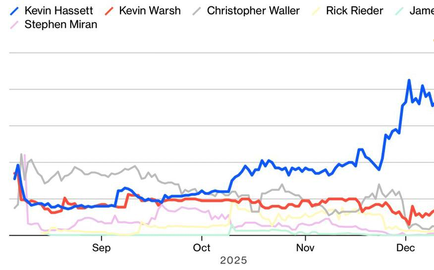 Что еще может пойти не так? Судя по комментариям Кевина Хассета о независимости ФРС, он может и не плясать под дудку президента. Неудивительно, что шансы основного противника Кевина Уорша в последнее время существенно выросли.