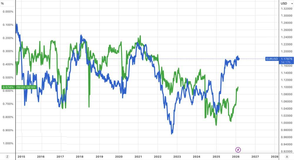 Динамика EURUSD и спреда доходности облигаций Франции и Германии