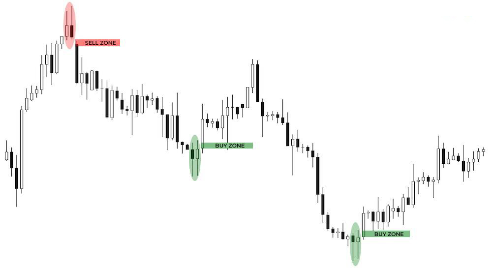| Как работает паттерн? | Трейдер должен установить отложенную заявку на открытие короткой или длинной позиции, на уровне минимумов или максимумов последней свечи паттерна (в зависимости от тренда). |