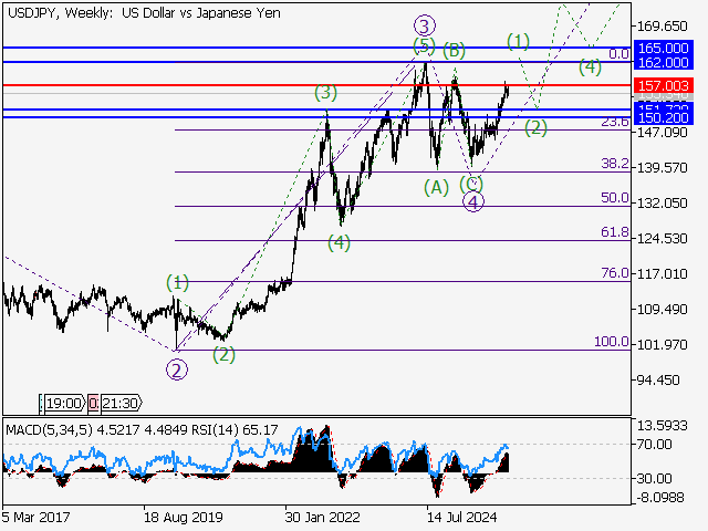 В рамках недельного таймфрейма сформирована восходящая волна старшего уровня 3, завершилось развитие нисходящей коррекции 4 и формируется волна 5. На дневном таймфрейме, по всей видимости, развивается волна (1) of 5, в составе которой сформировалась волна младшего уровня 3 of (1). В рамках 4-часового таймфрейма, предположительно, развивается локальная коррекция 4 of (1), в составе которой началось формирование волны c of 4. Если предположение верно, то снижение USDJPY продолжится к отметкам 151.73 – 150.20. Критическим для данного сценария является уровень 157.00, пробой которого позволит паре продолжить рост к отметкам 162.00 – 165.00.