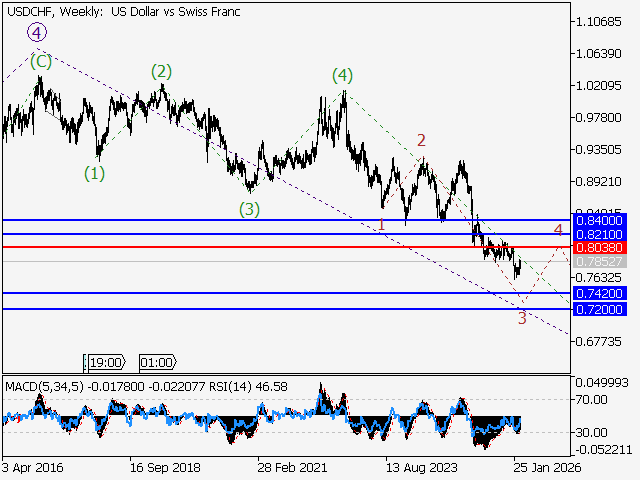 В рамках недельного таймфрейма развивается нисходящая пятая волна 5 старшего уровня, в составе которой формируется волна (5) of 5. На дневном таймфрейме, по всей видимости, развивается третья волна 3 of (5), в составе которой завершилось формирование коррекции в качестве волны iv of 3 и развивается волна v of 3. В рамках 4-часового таймфрейма, по всей видимости, сформировалась третья волна младшего уровня (iii) of v и предположительно завершается развитие локальной коррекции в качестве четвертой волны (iv) of v. Если предположение верно, то после ее завершения снижение пары USDCHF продолжится к отметкам 0.7420–0.7200. Критическим для данного сценария является уровень 0.8038, в случае пробоя которого пара продолжит рост к отметкам 0.8210–0.8400.