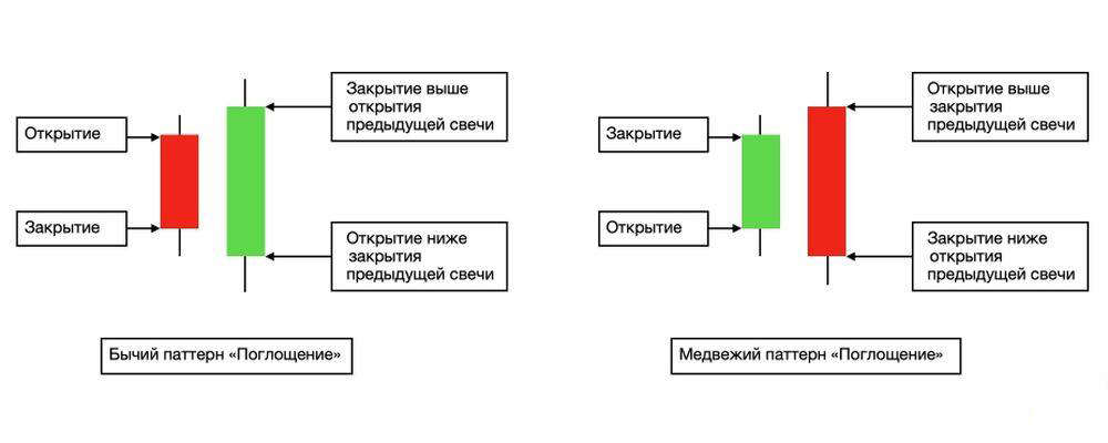 - Бычье поглощение формируется на нисходящем тренде, медвежье — на восходящем, указывая на смену рыночного настроения.