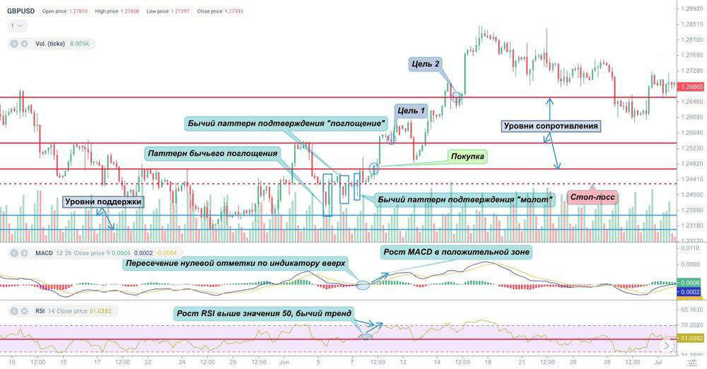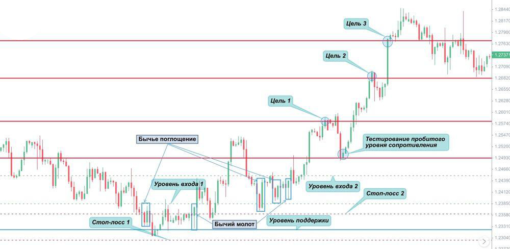 Тем не менее, стало понятно: цена достигла основания и после первого паттерна “поглощение” на уровне 1.2385 можно было открыть длинную позицию. Стоп-лосс устанавливается ниже уровня поддержки около 1.2304.