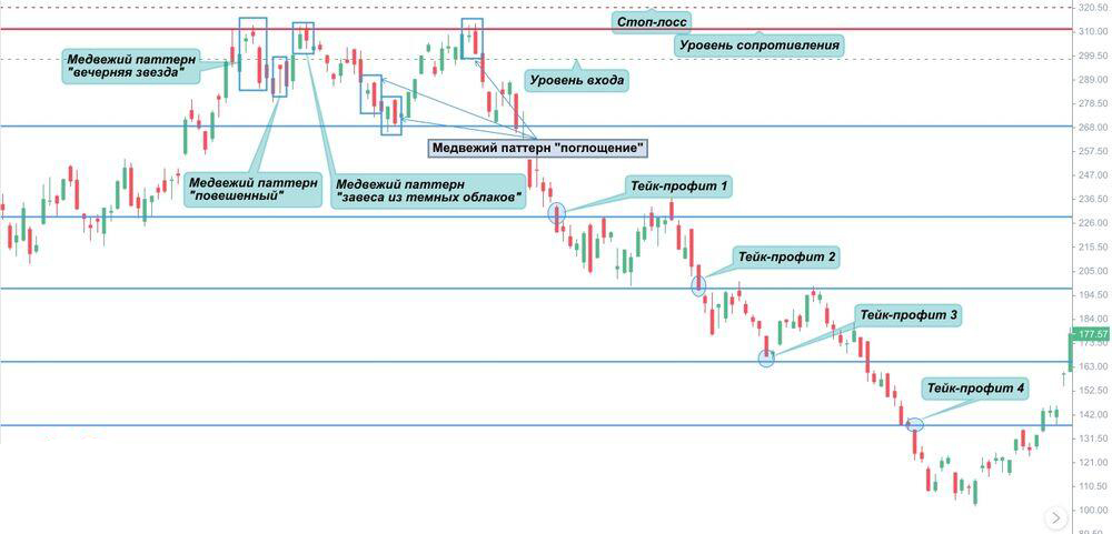 Перед окончательным разворотом и пробоем ключевой поддержки 268.00 на графике сформировалась серия медвежьих паттернов “поглощения”. Образованный паттерн на повторном тестировании уровня 310.00 стало окончательным сигналом на открытие коротких позиций с целями 268.00, 226.00, 194.50, 163.00, 142.00. Стоп-лосс при этом необходимо было выставить выше, около 320.50.