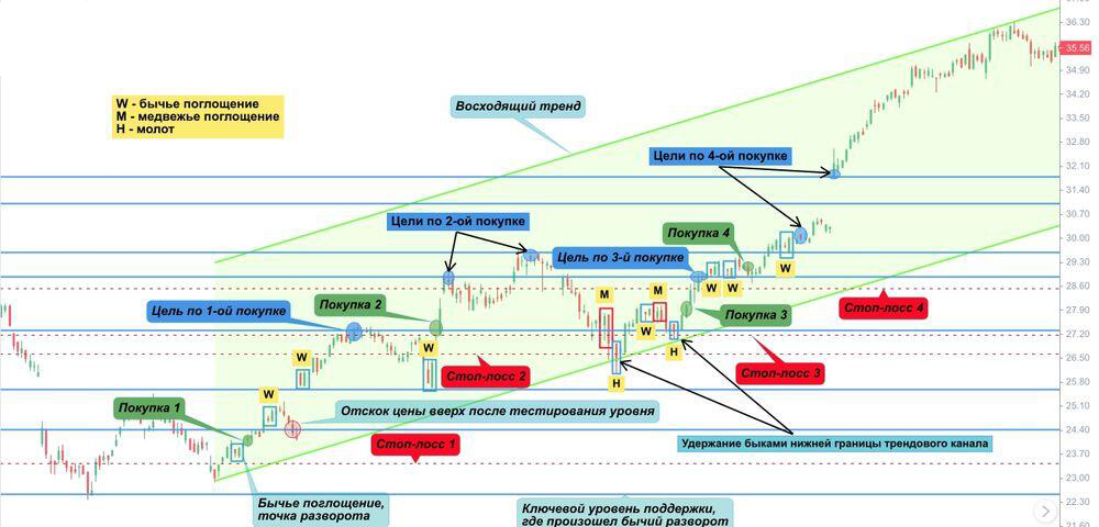 На графике видна серия разворотных свечных паттернов “бычье поглощение” после долгого нисходящего тренда. Эти модели послужили сигналом к глобальному развороту цены и началу длительного бычьего тренда.