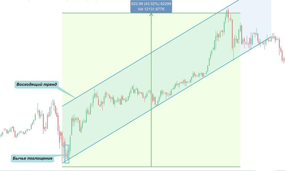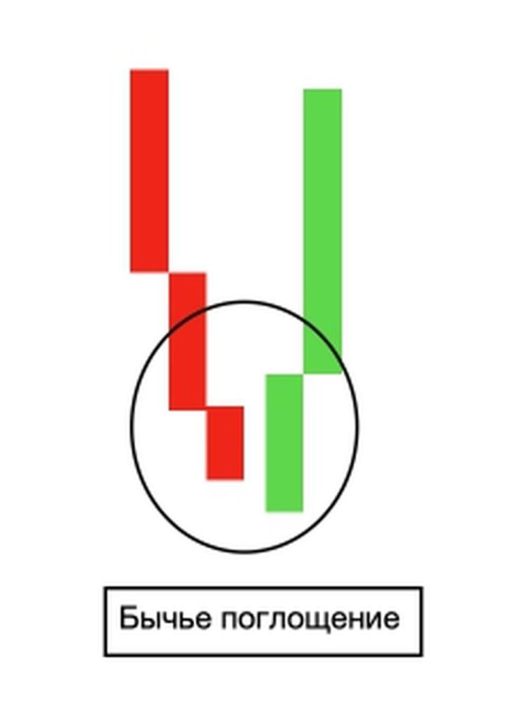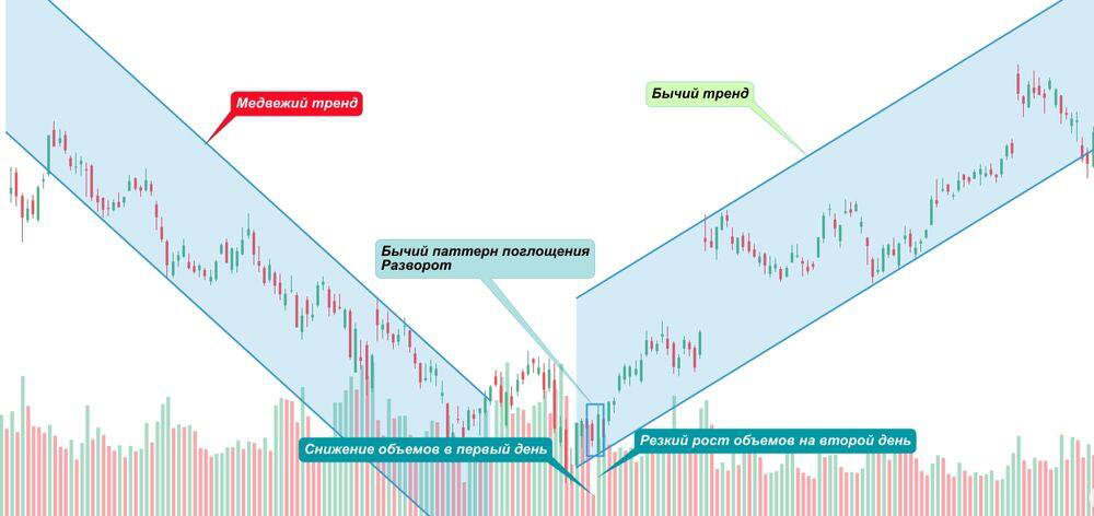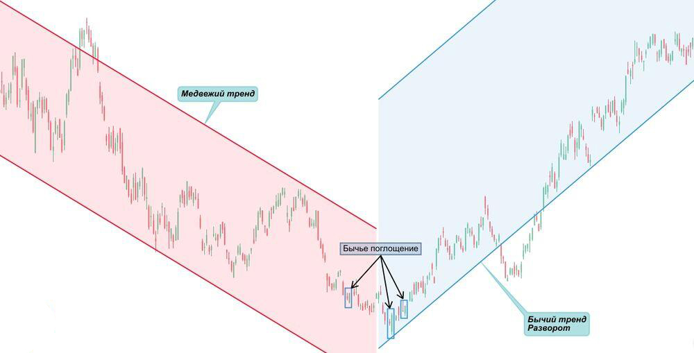 Образование паттерна “бычьего поглощения” на графике сигнализирует о том, что цена достигла основания и готовится к смене тренда на бычий.
