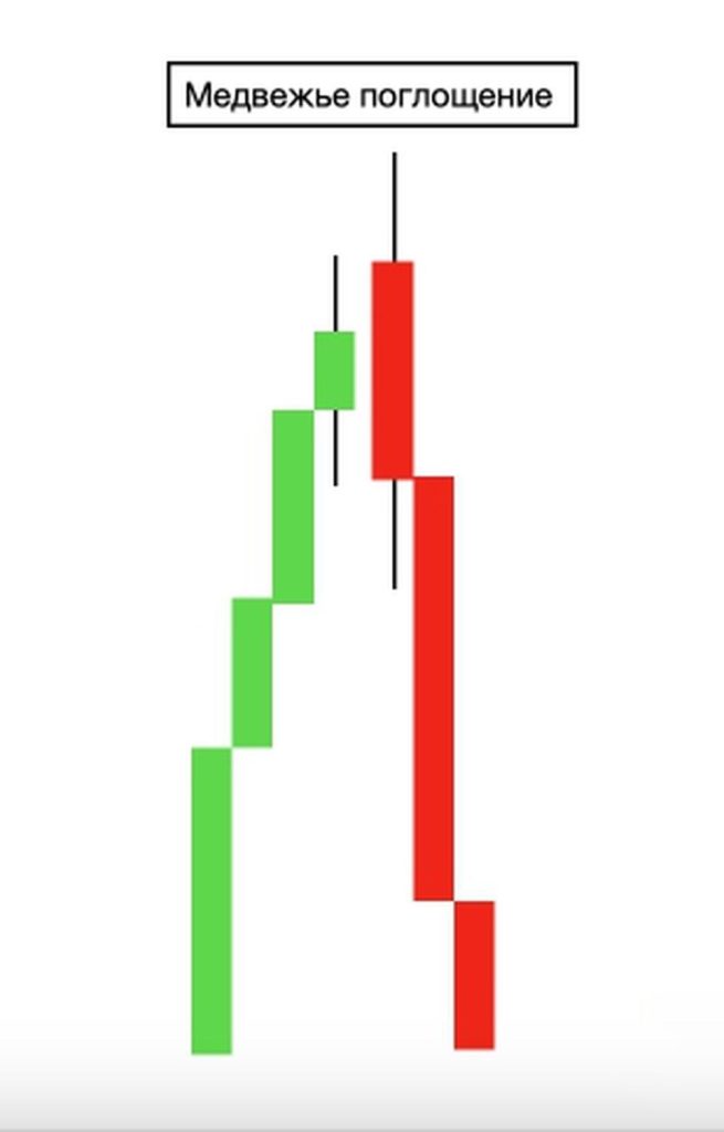 Медвежья модель поглощения состоит из двух свечей, первая из которых должна быть бычьей, а вторая — медвежьей. Вторая свеча является поглощающей и предупреждает о скором развороте цены вниз после восходящего тренда. Чем меньше тело первой свечи и длиннее тело поглощающей, тем выше вероятность медвежьего разворота. Также поглощение теней первой свечи помимо ее тела усиливает эффект и повышает вероятность разворота.