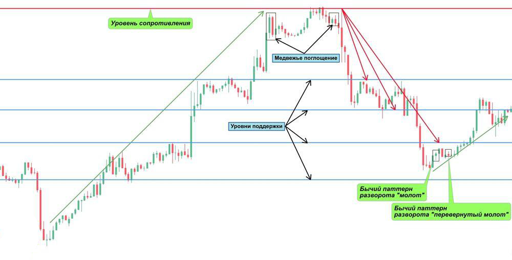 После появления паттернов “медвежьего поглощения” цена развернулась вниз и начала активно снижаться. Медвежий тренд был остановлен двумя разворотными моделями “молот” и “перевернутый молот”.