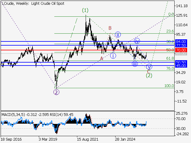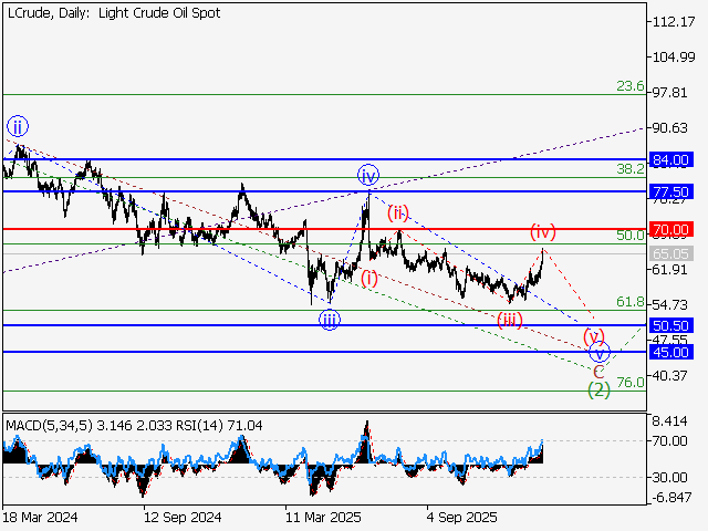 В рамках недельного таймфрейма предположительно продолжается развитие нисходящей коррекции в качестве второй волны старшего уровня (2), в составе которой формируется волна C of (2). На дневном таймфрейме, по всей видимости, завершилось развитие восходящей коррекции в качестве четвертой волны iv of C и идет формирование пятой волны v of C. В рамках 4-часового таймфрейма предположительно сформировалась третья волна младшего уровня (iii) of v of C и близится к завершению развитие локальной коррекции в качестве четвертой волны (iv) of v. Если предположение верно, то после завершения коррекции снижение WTI продолжится к отметкам 50.50–45.00. Критическим для данного сценария является уровень 70.00, пробой которого позволит цене продолжить рост к отметкам 77.50–84.00.