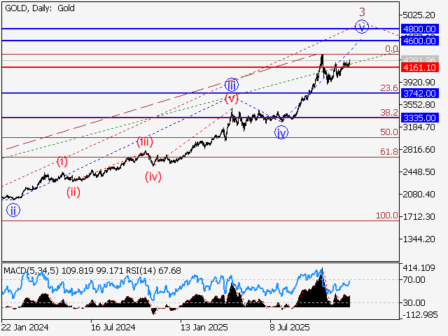 В рамках недельного таймфрейма, предположительно, развивается восходящая волна старшего уровня 5, в составе которой идет формирование волны (3) of 5. На дневном таймфрейме, по всей видимости, продолжается развитие волны младшего уровня 3 of (3), в составе которой формируется волна v of 3. В рамках 4-часового таймфрейма развивается волна (v) of v, в составе которой, предположительно, продолжается формирование волны v of (v). Если предположение верно, то рост XAUUSD продолжится к отметкам 4600.00 – 4800.00. Критическим для данного сценария является уровень 4161.10, пробой которого позволит паре продолжить снижение к отметкам 3742.00 – 3335.00.