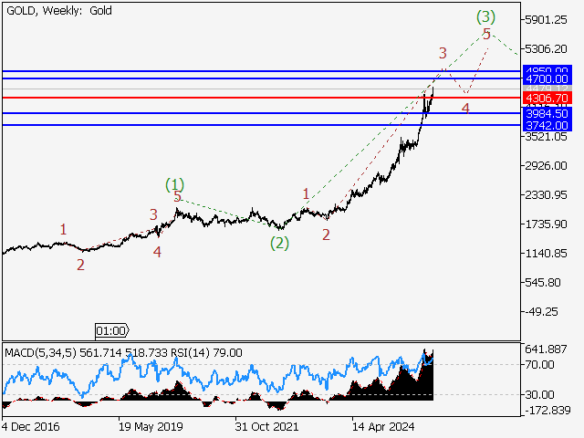 В рамках недельного таймфрейма предположительно развивается восходящая пятая волна старшего уровня 5, в составе которой идет формирование волны (3) of 5. На дневном таймфрейме, по всей видимости, продолжается развитие третьей волны младшего уровня 3 of (3), в составе которой идет формирование волны v of 3. В рамках 4-часового таймфрейма развивается волна (v) of v, в составе которой продолжается формирование волны iii of (v). Если предположение верно, то рост XAUUSD продолжится к отметкам 4700.00 – 4850.00. Критическим для данного сценария является уровень 4306.70, пробой которого позволит паре продолжить снижение к отметкам 3984.50 – 3742.00.