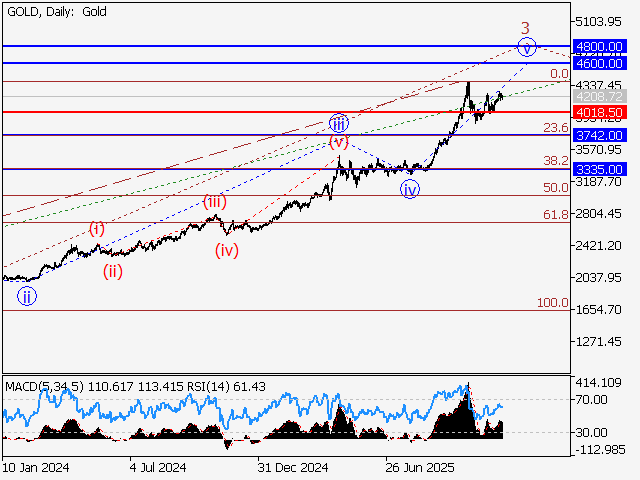 В рамках недельного таймфрейма предположительно развивается восходящая пятая волна старшего уровня 5, в составе которой идет формирование волны (3) of 5. На дневном таймфрейме, по всей видимости, продолжается развитие третьей волны младшего уровня 3 of (3), в составе которой идет формирование волны v of 3. В рамках 4-часового таймфрейма развивается волна (v) of v, в составе которой формируется волна v of (v). Если предположение верно, то рост XAUUSD продолжится к отметкам 4600.00 – 4800.00. Критическим для данного сценария является уровень 4018.50, пробой которого позволит паре продолжить снижение к отметкам 3742.00 – 3335.00.