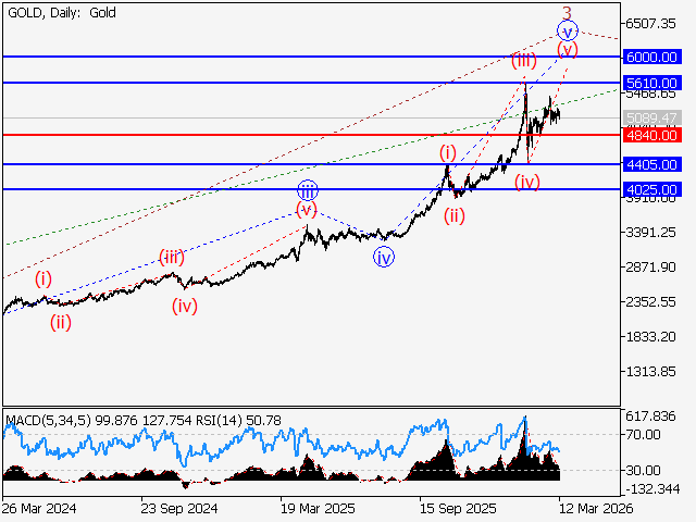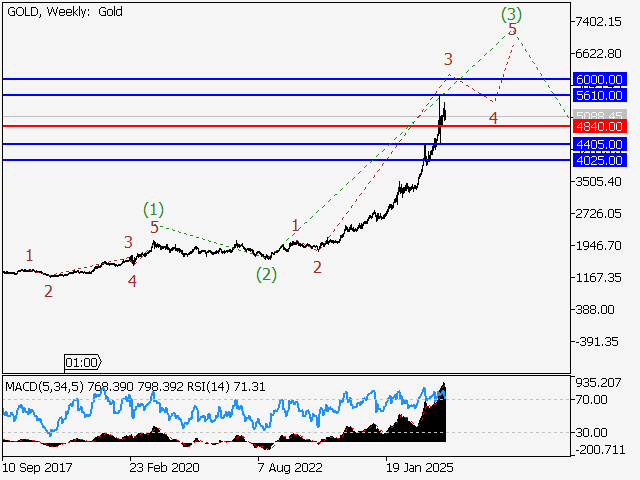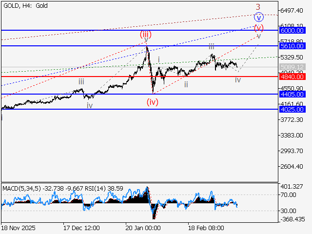 В рамках недельного таймфрейма предположительно развивается восходящая пятая волна старшего уровня 5, в составе которой идет формирование волны (3) of 5. На дневном таймфрейме, по всей видимости, продолжается развитие третьей волны младшего уровня 3 of (3), в составе которой идет формирование волны v of 3. В рамках 4-часового таймфрейма сформировалась волна (iii) of v и предположительно завершается развитие локальной коррекции в качестве волны (iv) of v. Если предположение верно, то после ее завершения рост XAUUSD продолжится к отметкам 5610.00–6000.00. Критическим для данного сценария является уровень 4840.00, пробой которого позволит паре продолжить снижение к отметкам 4405.00–4025.00.