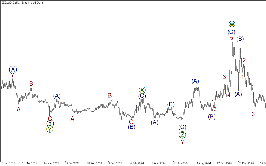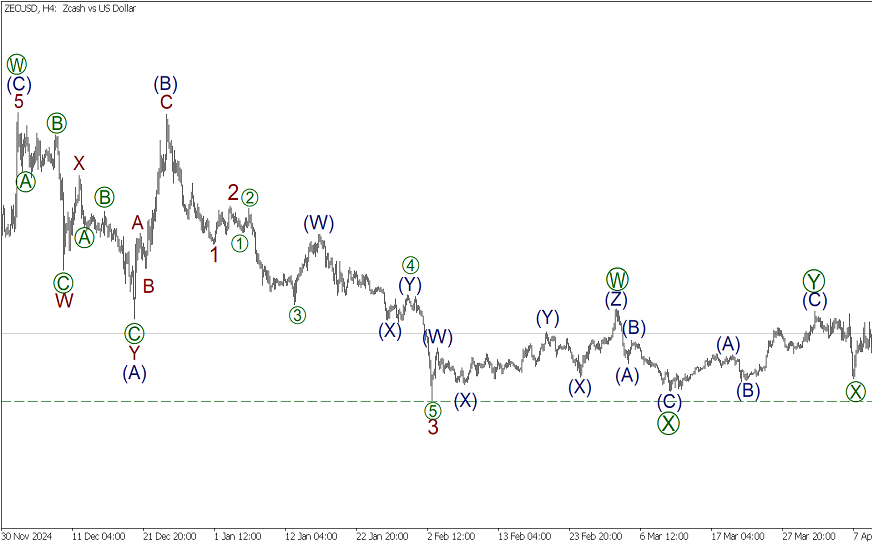 На дневном графике ZECUSD представлена разметка крупного коррекционного тренда. Вероятно, недавно подошла к концу действующая волна Y в виде тройного зигзага [W]-[X]-[Y]-[X]-[Z]. На последнем участке графика строится волна-связка X, которая, судя по начальной части, принимает форму двойного зигзага [W]-[X]-[Y]. Волны [W] и [X] – стандартные зигзаги (A)-(B)-(C).