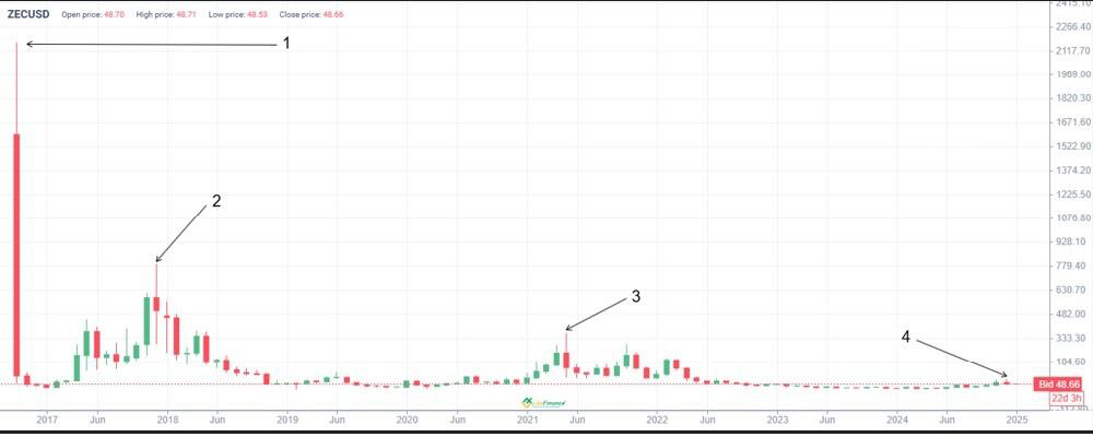 Ниже представлен график ZECUSD за последние десять лет. Чтобы сделать наши прогнозы максимально точными, важно оценить исторические данные.