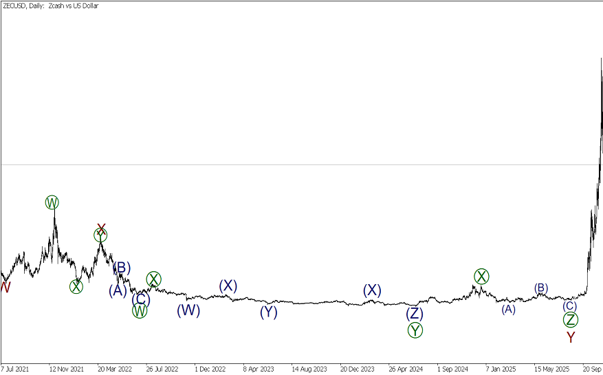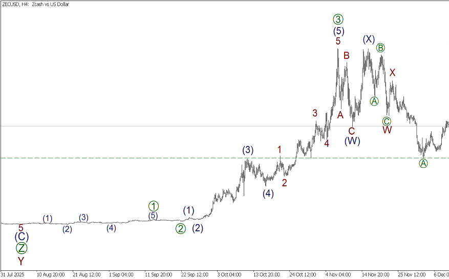 На дневном графике ZECUSD представлена разметка крупного коррекционного тренда. Сформированы волны W и X. Также, предположительно, завершилась действующая волна Y в виде тройного зигзага. Скорее всего, на последнем участке графика формируется волна A в виде импульса.