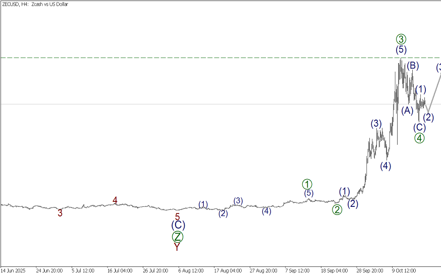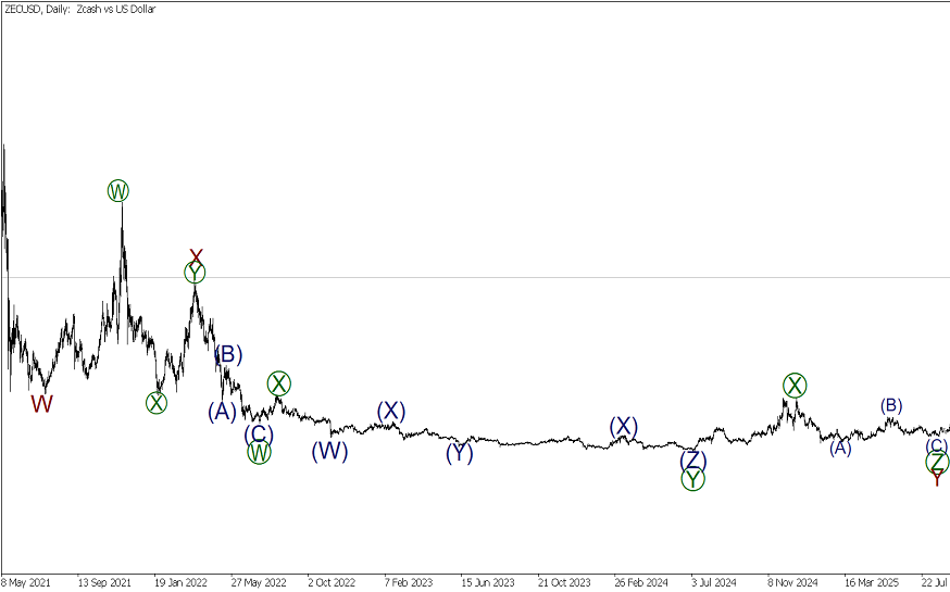На дневном графике ZECUSD представлена разметка крупного коррекционного тренда. Сформированы волны W и X. Также, предположительно, завершилась действующая волна Y в виде тройного зигзага. Скорее всего, на последнем участке графика формируется новый тренд, который принимает форму импульса.