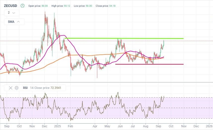 Согласно техническому анализу, открывать сделки прямо сейчас нецелесообразно — рынок перекуплен, а цена заметно выше скользящих средних. Оптимальной стратегией будет дождаться снижения ставки ФРС и уверенного закрепления ZEC над зоной сопротивления 55.00–56.00 или выше уровня 1.16 по TOTAL3. В этом случае можно рассматривать длинные позиции с частичной фиксацией прибыли около 72.00 и финальной целью в районе 79.00.